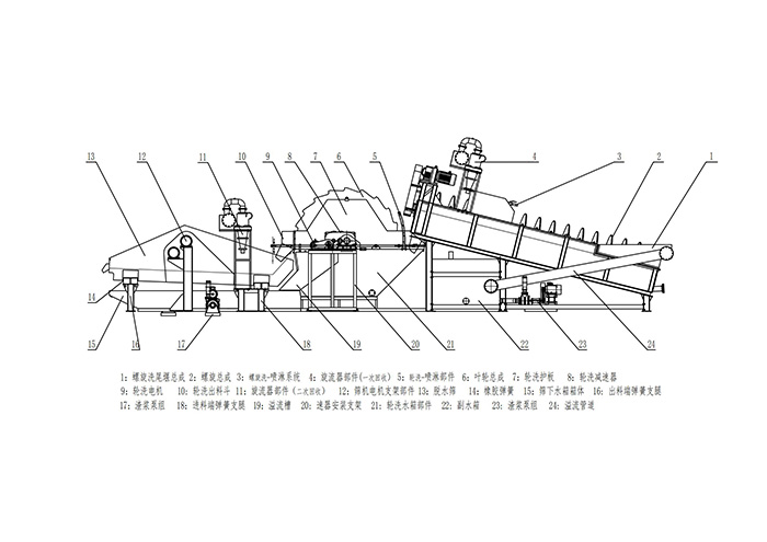 本機將輪斗洗砂機、螺旋洗砂機、尾礦脫水篩、分離器等部件結合為一體,使設備具有更強的物料清洗及回收能力。