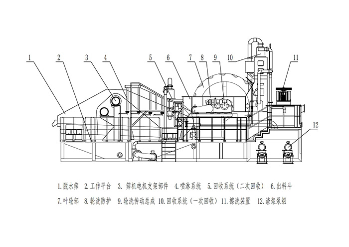 1、物料先經過擦洗機進行擦洗,除去砂顆粒表面附著的泥粉;擦洗后的物料進入輪洗洗砂機進行二次清洗、控水,達到泥沙分離效果,最后清洗后的粗、細砂進入脫水篩進行脫水,因此實現高效洗砂。